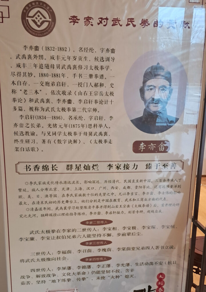 W okresie Jiaqing i Daoguang dynastii Qing, Wu Yuxiang uczył się tej sztuki u Chen Qingpinga z Zhaobao i otrzymał podręcznik Taijiquan autorstwa Wang Zongyue z Shanxi. Był pionierem badań teoretycznych i stosował unikalne podejście do prowadzenia praktyki za pomocą teorii. Li Yiyu i Li Qixuan poszli w jego ślady, pilnie studiując i przekraczając samych siebie.